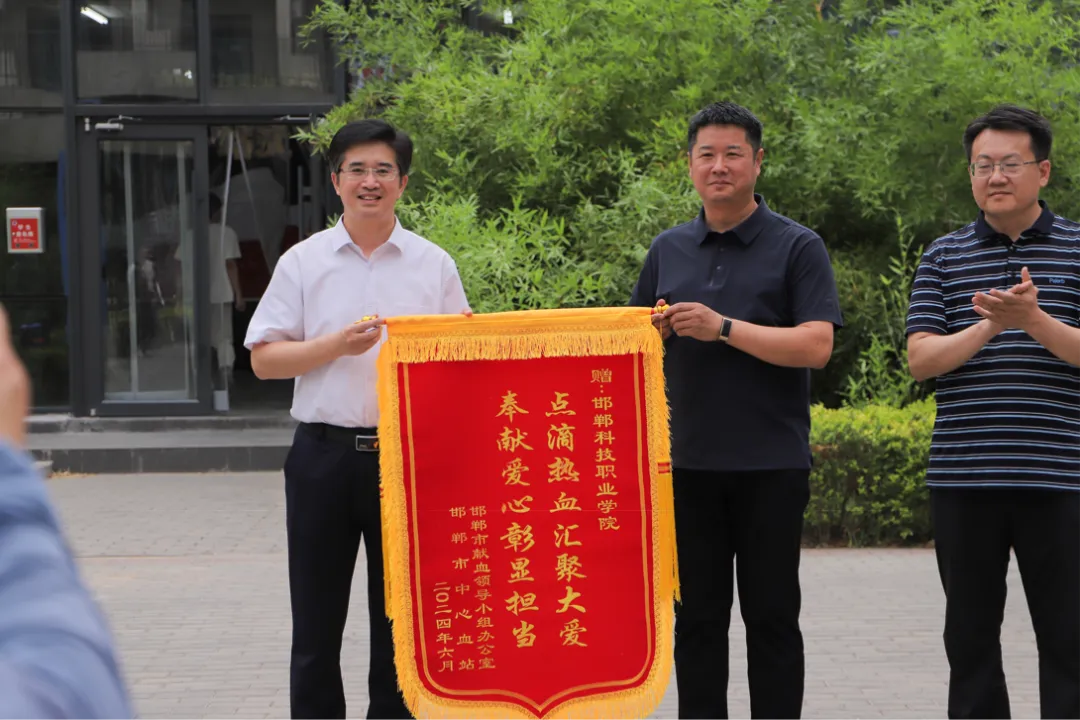 邯郸市中心血站向学院赠予“点滴热血汇聚大爱 奉献爱心彰显担当”锦旗,同时颁发荣誉证书,对学院积极支持献血事业表示敬意与感谢。
