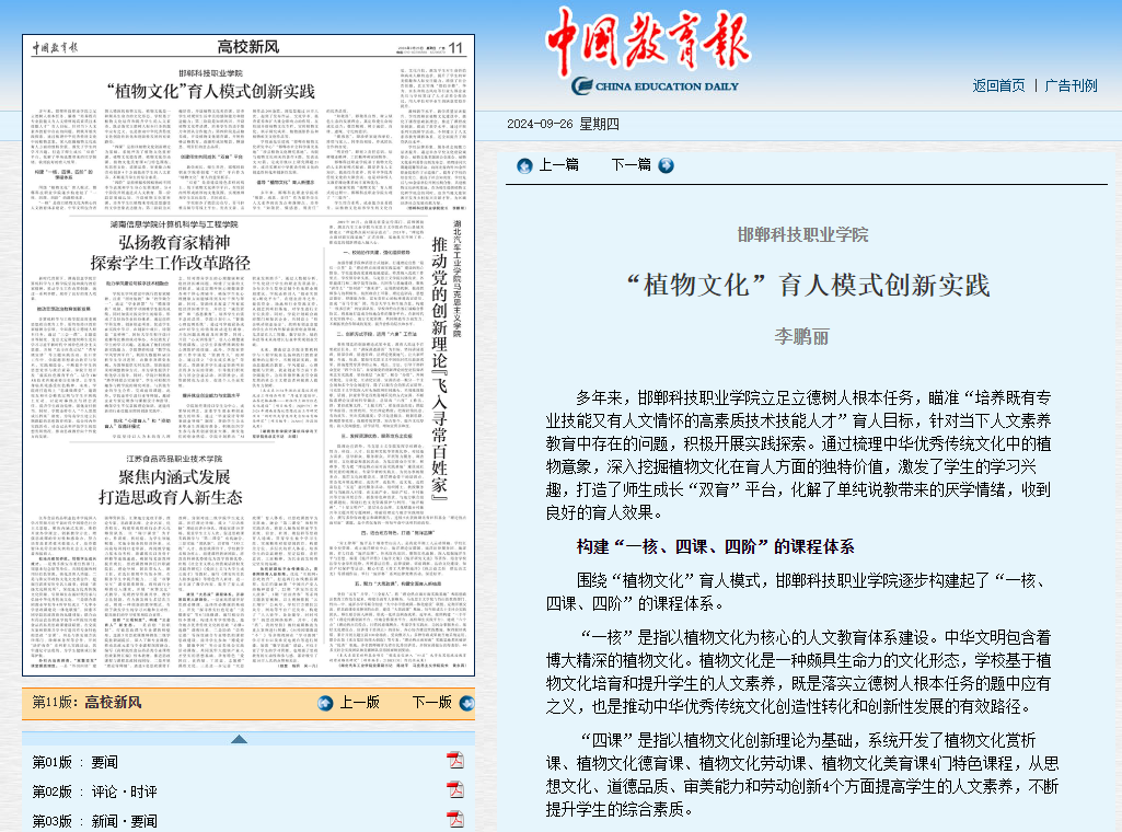 近日,《中国教育报》刊发点点官方app下载党委副书记、院长李鹏丽署名文章《“植物文化”育人模式创新实践》。