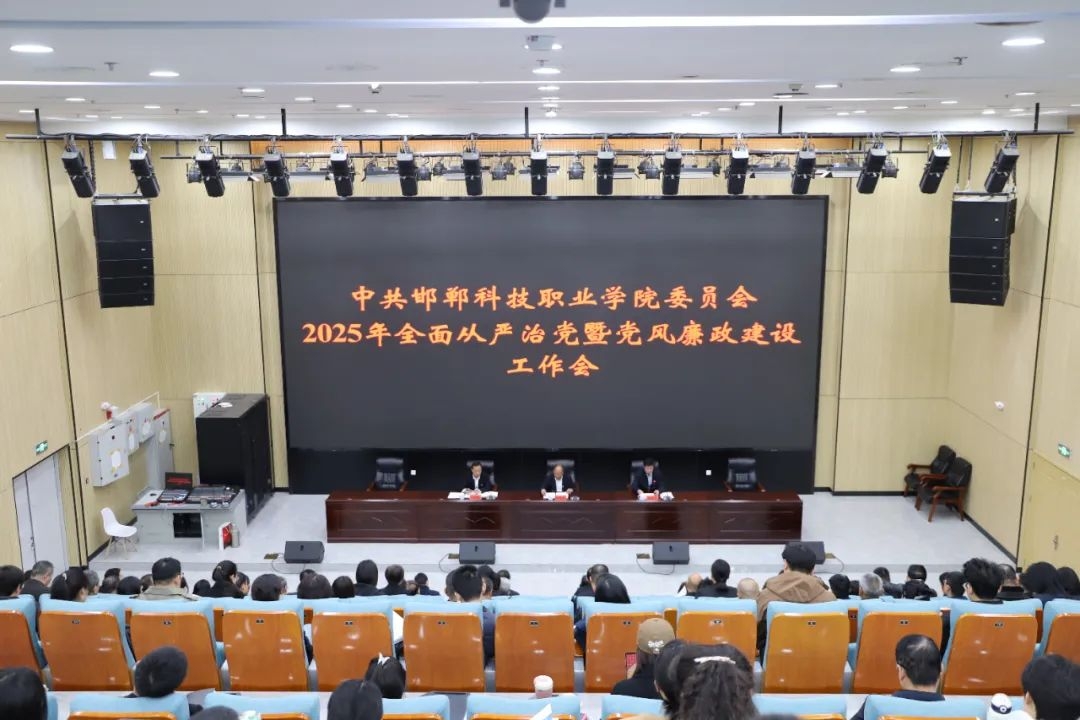 4月2日上午,学院党委在邯郸职教城国际学术交流中心一楼报告厅召开2025年度全面从严治党暨党风廉政建设工作会。学院党委书记杨万春出席并讲话,党委副书记、院长李鹏丽主持,党委班子成员出席。