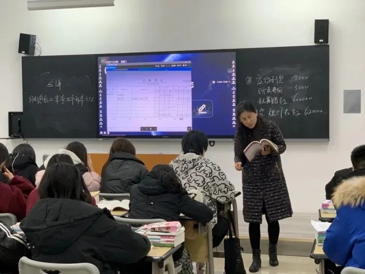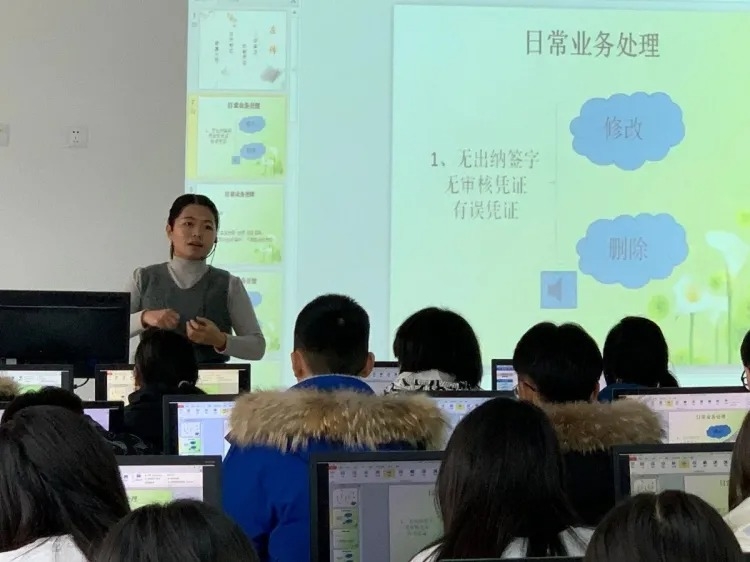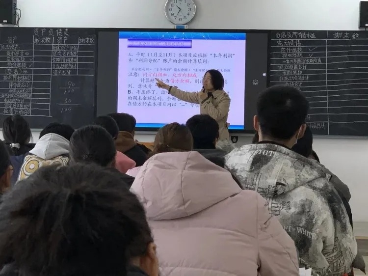 12月3日,申晓静老师在107教室讲授《企业会计》。申老师紧扣“短期借款”主题,针对学情,展开师生互动,节奏明快,风格流畅,为示范课观摩活动开了个好头。12月8日上午,范利霞老师在404教室讲授《财务会计》。同样是“短期借款”的讲授,不一样的教师展现出不同的课堂魅力。范老师利用故事和身边事例进行新课导入,配以课堂巩固练习和提高练习,条理清晰,逐步渗透。12月8日下午,赵园园老师在实训楼338机房讲授《会计实训》。赵老师巧妙利用《左传》“知错就改,善莫大焉”导入新课,依次示范操作了凭证的修改、删除与审核,启发学生思考,引导学生学习。12月11日,王冀霞老师在205教室讲授资产负债表的编制。王老师在讲课过程中注重细节,内容充实,讲练结合,充分表现出老教师的内涵与底蕴,实现了这次观摩活动的完美收官。