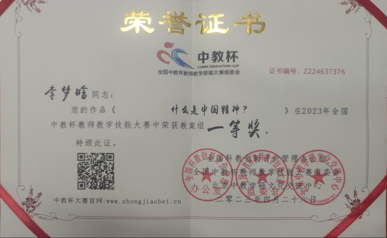 思政课教师李梦涵获得中教杯教师教学技能大赛一等奖