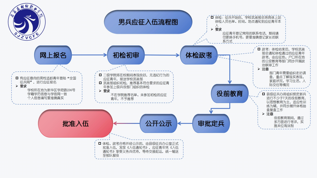 根据学院的征兵工作安排,凡我院学生有意愿参军入伍,在网上报名完成后,辅导员老师针对学生在校期间表现以及学业完成情况进行初步考察,考察通过后会推荐到学院武装部,才可以参加学校组织的初检、上级兵役部门组织的体检等后续工作。